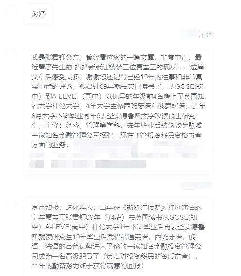 2019年,他顺利进入伦敦一家知名的金融管理公司,展现了他在金融领域的才华。除了西班牙语和俄语,他还精通英语、法语等多国语言。张君钰虽然在新版《红楼梦》中戏份不多,但他的表现广受好评。尽管当时年幼选择赴英深造,但他依然在职场上取得了显著的成果。