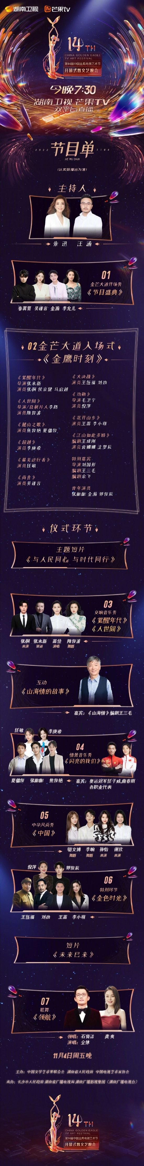 我们来看一下金鹰节开幕式的节目单:由湖南卫视主持人汪涵和央视主持人朱迅联袂主持;其他有名的明星有秦霄贤、吴谨言、金瀚、刘劲、倪萍、焦俊艳、袁姗姗、沈梦辰、王雷、李小萌、任敏、张彬彬、郭俊辰、李庚希、孙怡等。