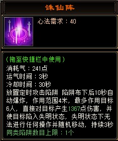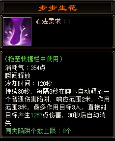 持续30秒,每隔3秒在脚下自动释放一个普通伤害陷阱,响应范围2米,作用范围3米,最多作用目标3人,直接对目标产生一定伤害,30秒后自动消失。