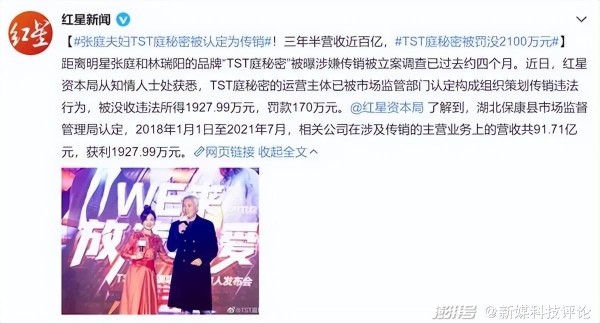 上周,张庭夫妇运营的TST庭被市场监管部门认定构成组织策划传销违法行为,被没收违法所得1927.99万元,罚款170万元。