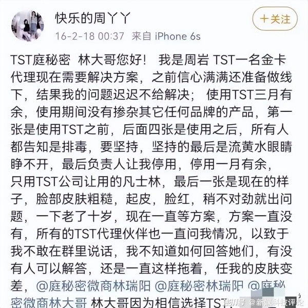 近年来,其多次因质量问题陷入争议,早在2016年就有多位消费者反映“TST庭秘密”化妆品会导致“烂脸”,出现不同程度的过敏,脸上出现硬疙瘩、痘痘等不正常症状。
