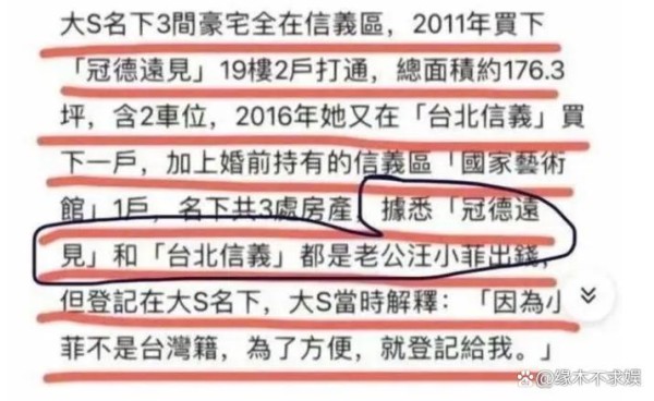 大S和汪小菲婚后分别于2011年、2016年购下了“冠德远见”“台北信义”两套豪宅,当时媒体都有大肆报道,大S面对媒体的采访满是嫁入豪门的喜悦,表示两套房子都是汪小菲出钱:因为小菲不是湾湾籍,为了方便,就登记给我。