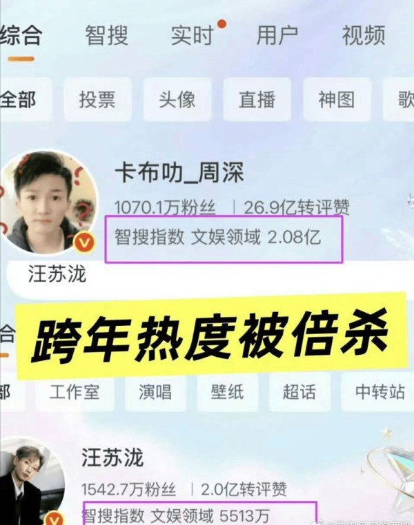 周深文娱领域指数:2.08亿;汪苏泷文娱领域指数5513万。