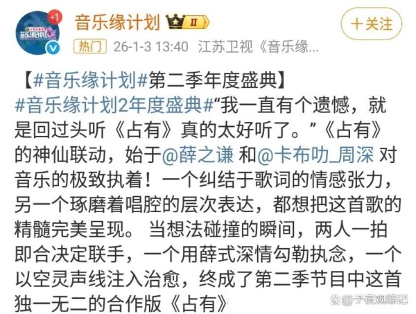 《音乐缘计划2》周深薛之谦双版本舞台炸场,刘宇宁摇滚演绎引发热议,获年度大众喜爱作品