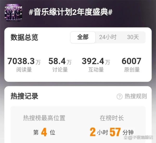 我专门去查看了下数据,音乐缘计划,2年度盛典话题阅读量7038.3万,互动量392.4万。