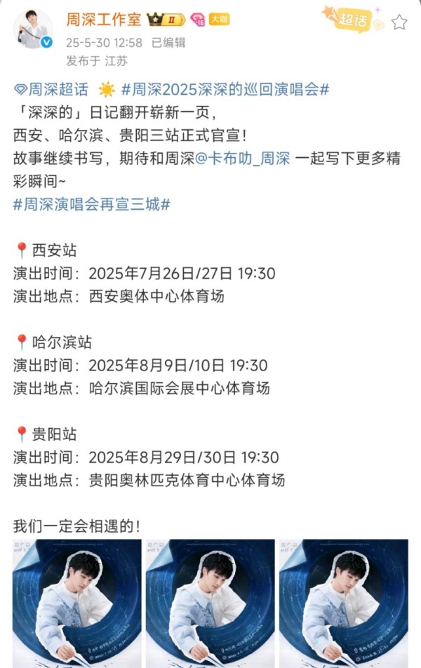 5月30日,周深工作室官宣解锁了三个巡演的新城市,分别是西安、哈尔滨和贵阳。7-8月,一起与周深相见在暑假的演唱会,听他慢慢解锁温柔的新迷你专辑《小深情》吧!