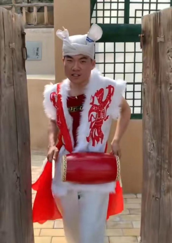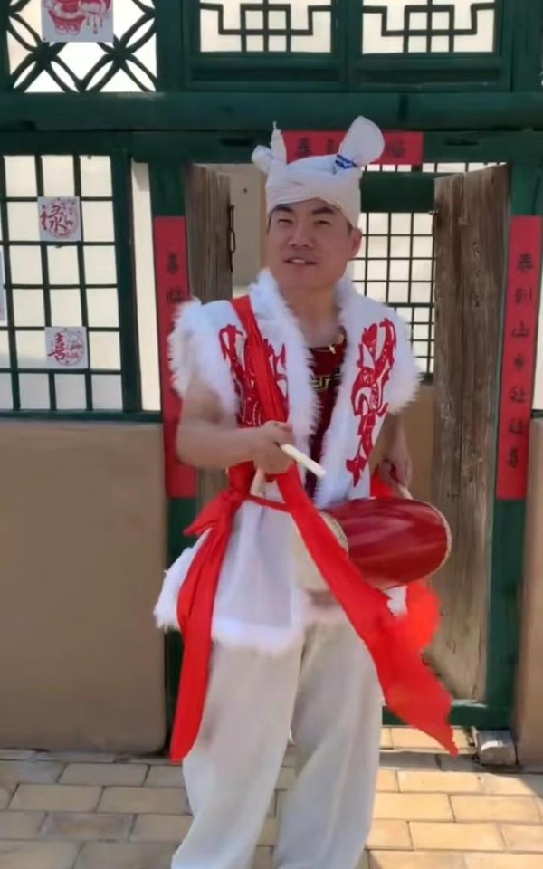 可以看出,他穿着“乡土”服装,穿着腰鼓。他头上的装饰是不同的,