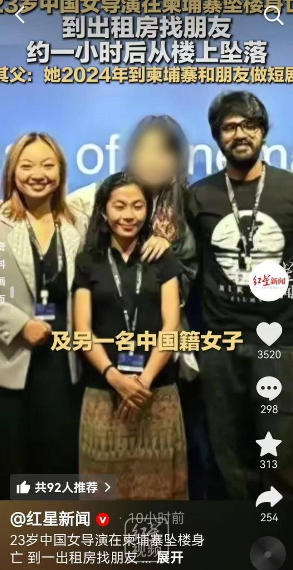 赖女士出生在天津,祖籍福建。她高中时期曾在加拿大读书,后来前往美国深造,主修导演专业。毕业后,她一直从事短剧的拍摄工作,作为导演、演员、音乐人参与了多部短片和长片的制作,且她的作品曾多次入围多伦多国际电影节的终选名单,展现出作为一名新兴导演和演员的无限潜力。今年12月23日,赖女士还在自媒体上更新了一条信息,写道:“这趟分别被拉得好长,月亮在身后,会很勇敢。”赖女士的父亲表示,她原计划在2024年到柬埔寨拍摄一部短剧,没想到竟发生了这样的悲剧。