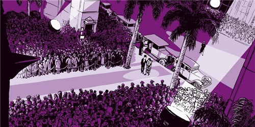 (30年代常见的场景,也是我们现在在电影中总能看见的场景:从豪华轿车中走出来的明星,受到万人的追捧与爱慕。)