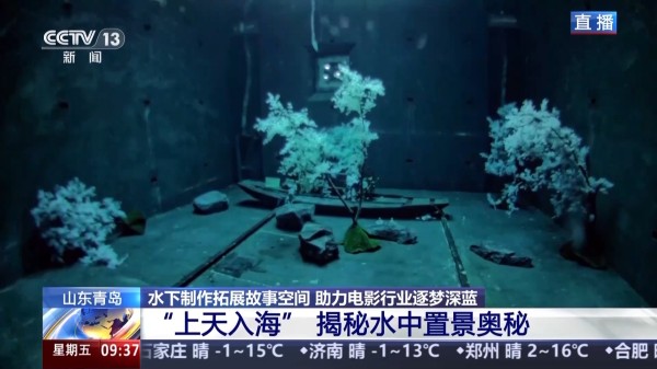 总台记者 李美慧:我现在就在青岛东方影都的水下制作中心,身后是青岛电影学院的师生和摄影师正趁着没有剧组拍摄的空档进行水下拍摄的交流学习。显示器上所显示的就是水底的情况。可以看到一艘船静静地沉在水底,旁边还有石头、三五棵树互相掩映。构成了一幅静谧的画卷。看着这幅画面脑海里是不是就已经浮现出很多关于水下世界的想象?