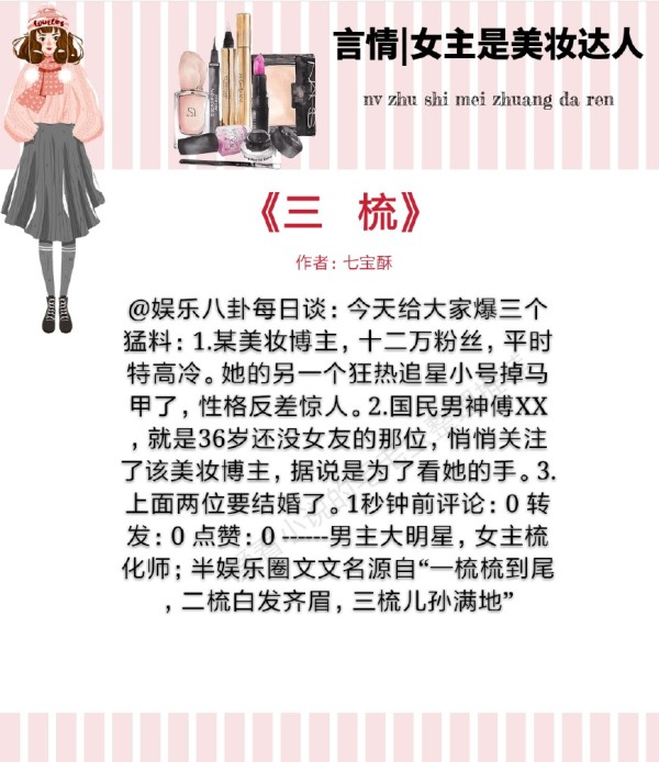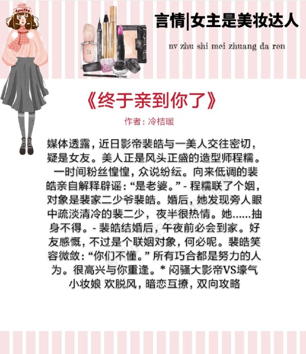 小短评:闷骚大影帝vs壕气小妆娘欢脱风,暗恋互撩,双向攻略,男主少年时遇到女主后就喜欢上女主了,家里出事无奈出国了,拯救了企业后,就去当明星了,但是男主没接感情戏,接的都是悬疑什么类的,男主找机会偶遇女主,找机会送女主回家,知道女主地址后就立马搬到女主隔壁了,男主自己去网上找资料,写了个追女孩攻略,在餐厅偶遇女主后,用调查问卷的方式得知了女主的喜好,回去后苦练厨艺,女主工作室看女主给男主装扮弄得好,想抢这个名额,女主和工作室解约后工作室想黑女主,男主发微博给女主正名,宠文无虐,作者文笔不错,强烈推荐!