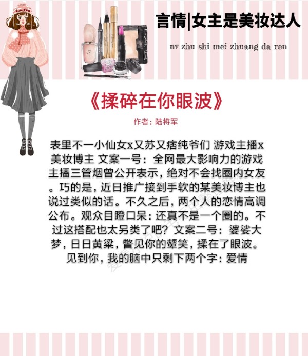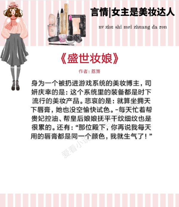 小短评:腹黑皇子NPCvs机灵美妆博主,美妆博主车祸植物人后进入一个化妆游戏系统。如鱼得水,通关满分。同时吸引各类NPC的注意,发展感情线。而人工智能也慢慢发展,问题接踵而至,最后都得到了解决。回到现实世界与爱人相守。有毒啊!疯狂种草文!还好后期走剧情感情戏(才怪!并没用!)种草少了些(呵呵,然后出一堆限量版),反正言情种草两不误,激起了一片“买买买”的呐喊!跟着作者君一起踏上美妆剁手之路!恋爱不如化妆,没有女孩子能够拒绝!萌萌的角色萌萌的文,轻松活泼风格,强烈推荐!
