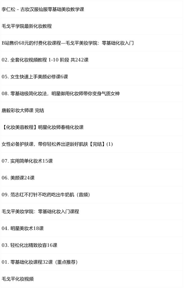 明星 / 专业化妆师课程:李仁松古妆汉服仙服零基础美妆课、毛戈平学院最新化妆教程(含 B 站售价 68 元的零基础入门课)、唐毅彩妆大师课(完结)、明星化妆师春楠化妆课; 不同场景 / 难度化妆课:零基础化妆课程 32 课(重点推荐)、全套化妆视频教程(1-10 阶段共 242 课)、女生快速上手美颜必修课 6 课、零基础极简化妆法(气质女神向)、实用简单化妆术 15 课、美颜课 24 课、明星美妆术 18 课、轻松化出精致妆容 16 课; 护肤相关内容:女性必备护肤课(完结,养逆龄好肌肤)、范志红 “不打针不吃药吃出牛奶肌” 音频课。