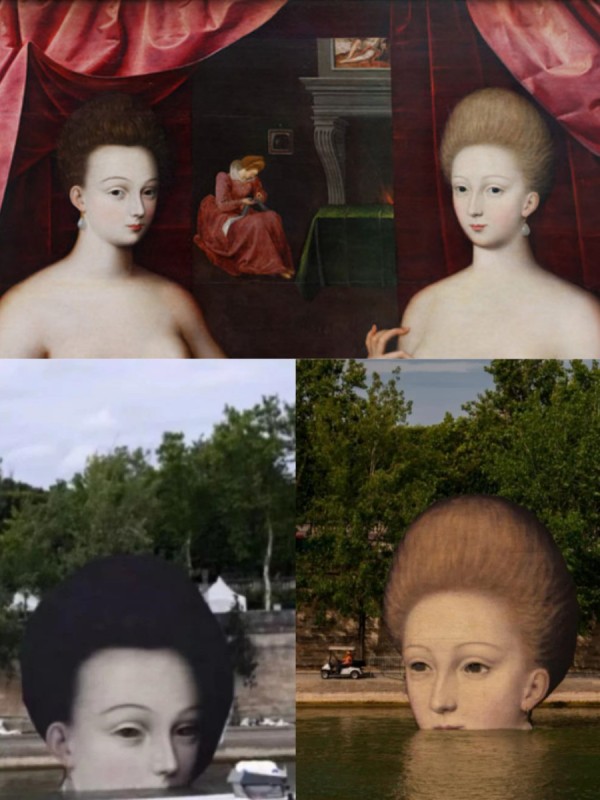塞纳河中浮现出的加布丽埃勒巨大头像出自枫丹白露画派的经典画作《加布丽埃勒姐妹》,绘制于16世纪末期。画作右侧的女性就是加布丽埃勒,她是法国国王亨利四世一生的挚爱,画作中的她小腹微隆。左侧的女性是她的姐妹维拉公爵夫人,两人一同沐浴在迎接新生儿的喜悦中。画作背景中,一位宫廷妇人正在为即将出生的国王之子缝制衣服。整幅画洋溢着女性之间的默契、关爱和陪伴,流露出安宁与柔美的气息。