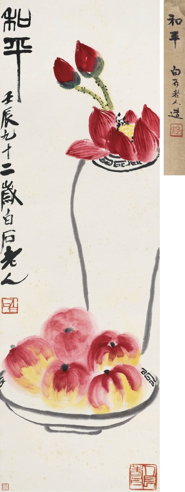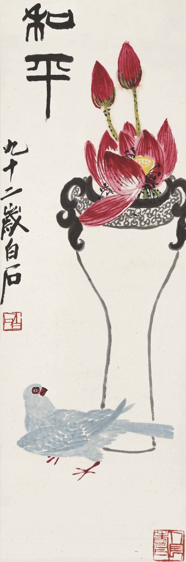 齐白石同年的两幅《和平》一幅给大文豪老舍,一幅赠女弟子郭秀仪和黄琪翔将军。