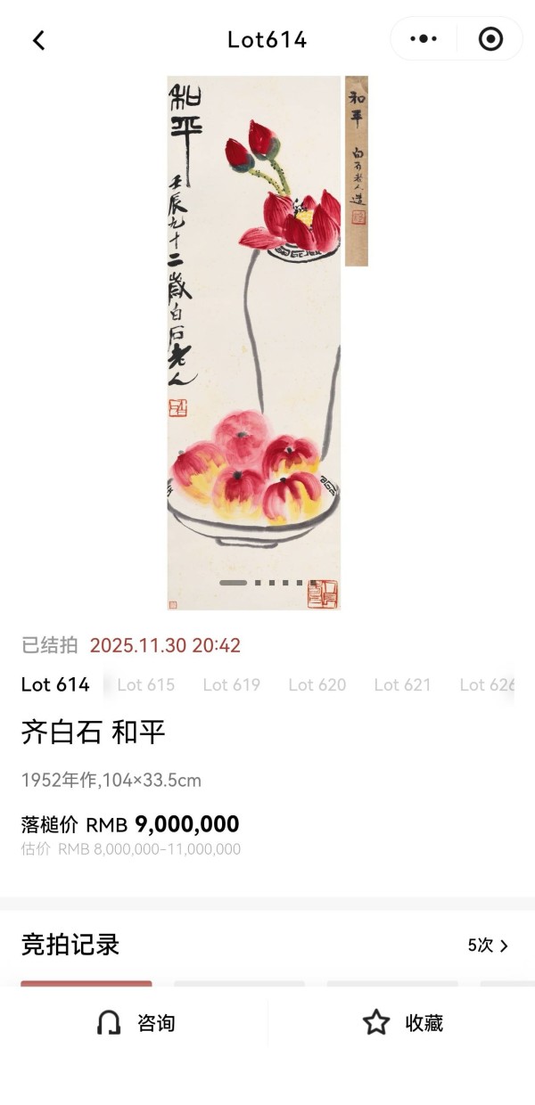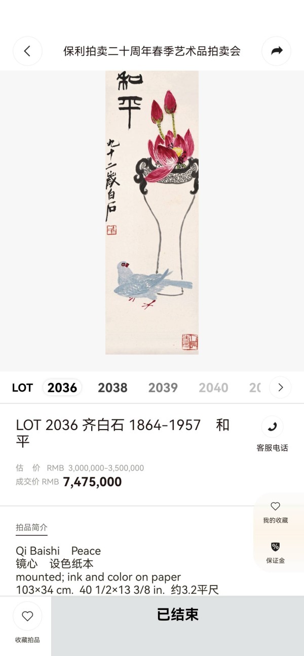 2025年拍卖两幅齐白石同年同尺幅的两幅《和平》747万和1035万~