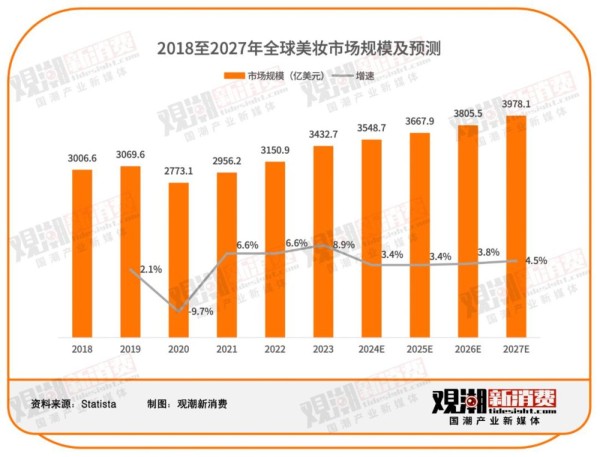市场竞争激烈,海外品牌败走,国货品牌们也打起了反攻战。 根据Statista数据,2023年,全球美妆市场规模达3432.7亿美元,同比增速达到8.9%。据预测,2027年全球美妆市场规模将近4000亿美元。