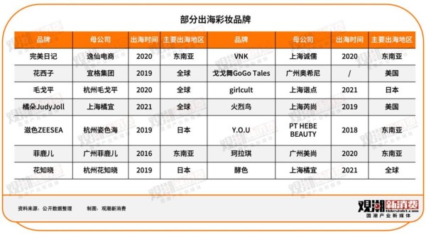 出海品牌中,不仅有完美日记、花西子等已成功开拓国内市场,希望在海外寻找第二增长曲线的成熟品牌,也包括直接在海外市场本土化孵化的新品牌,即扎根于海外本土市场,通过全渠道高密度的点位覆盖和差异化的服务深耕当地渠道深度分销来完成出海的品牌,例如深耕东南亚的菲鹿儿、Y.O.U等。