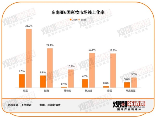 根据飞书深诺数据,东南亚的线上化和电商发展为国货美妆出海奠定了基础。 随着电商渗透率的逐步提升,美妆护肤品类也呈现出了快速线上化的趋势。 以美妆线上化最高的印尼为例,2016年护肤品的电商销售占比仅为1.3%,而2021年已经提升至20.9%,彩妆品类的线上化率更是突破了3成。
