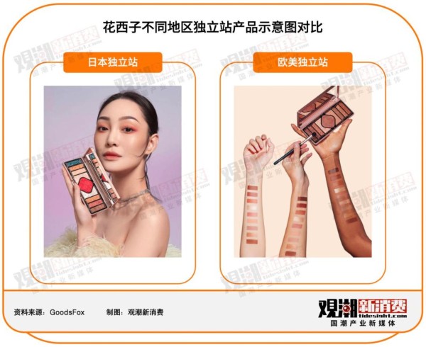 在推广上,花西子在日本市场和欧美市场进行近似的广告大片投放,但在独立站的产品落地页中,日本市场的主要模特图为东方面孔,妆面清透;欧美市场妆容则更加个性,且配有不同的肤色对比图。