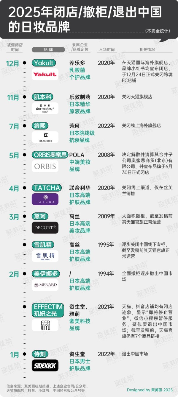 据聚美丽不完全统计,2025年共有10个日妆品牌在华败北,依相关情况进行粗略统计,大致可以分为闭店、撤柜、退出中国市场三类。