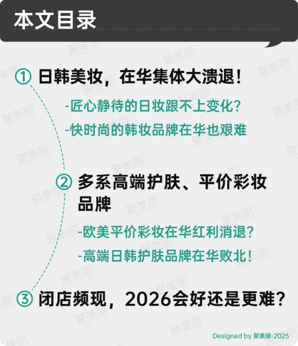 那么,在比难更难的2025年,发生这种大溃退,背后究竟揭示了什么?日韩妆在华真的不行了吗?欧美平价彩妆不敌国货?2026年,国际美妆在华发展会变好吗?带着追问和思考,聚美丽本文将对2025年国内外美妆品牌在华闭店、退场等情况进行梳理分析。