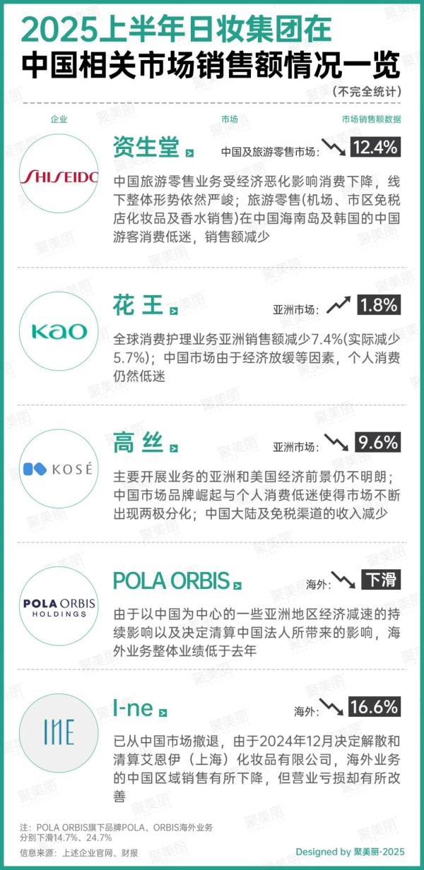 市场数据的反馈最为直观。聚焦日妆在华情况,在2025上半年业绩中,日妆受中国市场增长拖累。资生堂、高丝、POLA ORBIS、I-ne在包括中国在内的相关市场均呈下滑,花王为五大日妆集团中唯一一个所有市场全线增长的,但增幅均未超过5%。