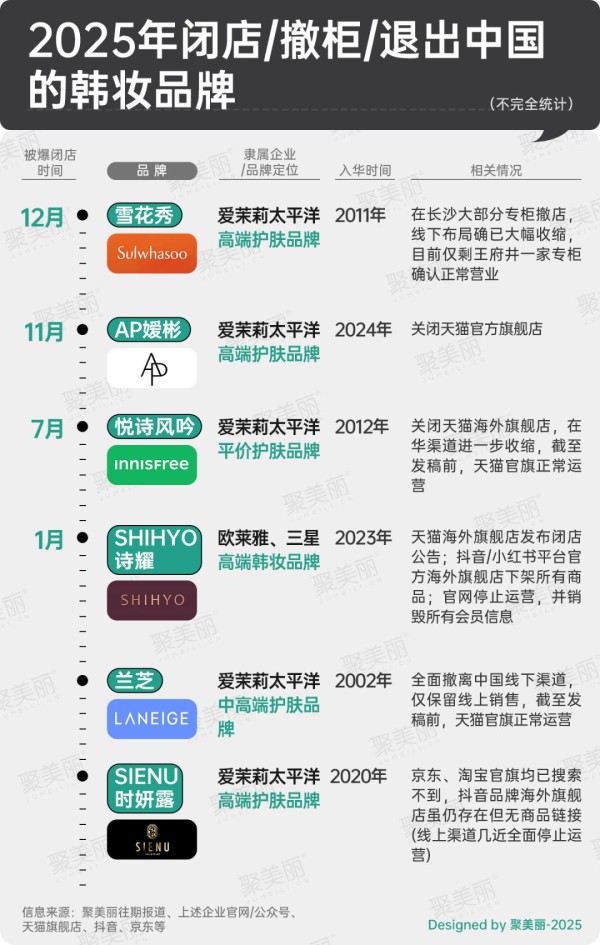 此时,再聚焦2025年闭店或撤柜/退出中国的韩妆品牌,据聚美丽不完全统计共有6个,且大多在华难言乐观,如近段时间被曝长沙地区大部分撤柜至仅剩一家的雪花秀,败退线下。