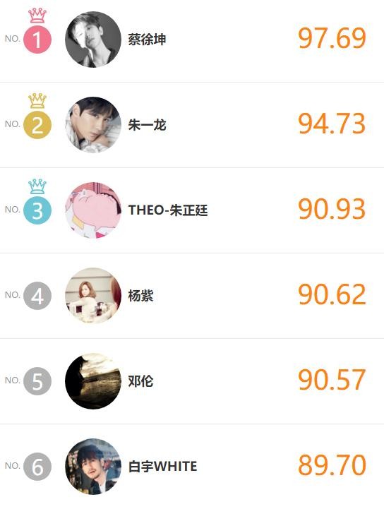 最新明星势力排名出炉:朱一龙不敌蔡徐坤居次席,邓伦冲至第六