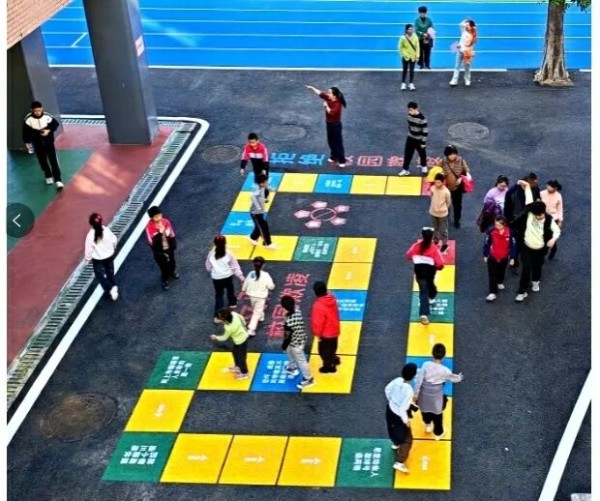 在学校大课间,操场空地上彩绘的跳格子、数字路径等,悄然吸引孩子们投身户外活动,四处洋溢着欢声笑语。学校引入的AI体育测训机,成了孩子们喜爱的“智能伙伴”,它支持高抬腿、深蹲、跳绳等多种体能项目,通过摄像头精准识别动作、自动计数并生成数据,以科技手段激发学生的运动兴趣。