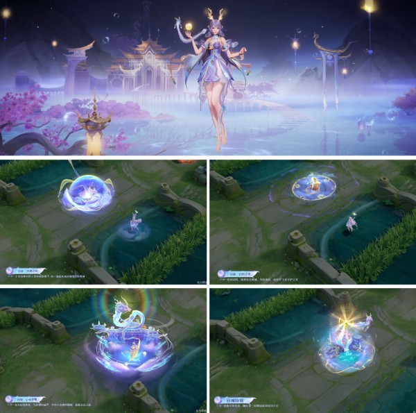 技能设计相对于原皮肤打击感和反馈感会更清晰,将云层与龙元素结合,色彩看起来更丰富;一技能释放在地面出现龙纹图标,二技能的特效将高级感的祥云元素加入,三技能主要呈现的是海洋生物的游动特效,整体看起来还是比较精致。