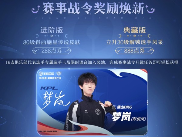 2026赛事战令也将引来一次升级,主要焕新了一些奖励,赛事战令分为进阶版和典藏版,典藏版专属可以额外获得16支俱乐部代表选手专属选手卡及限时语音以及西施的星传说皮肤个性按键等。如果不是很喜欢这些奖励也可以不用考虑典藏版赛事战令。
