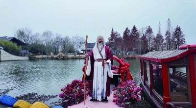 一艘布满红色花朵装饰、格外喜庆的小船顺着河流缓缓通过归闲桥、水山桥,船上站着一位须发皆白、拄着拐杖的月老,笑意盈盈地捋着胡子……去年12月23日,微短剧《天降小红娘》正在钱家渡拍摄。