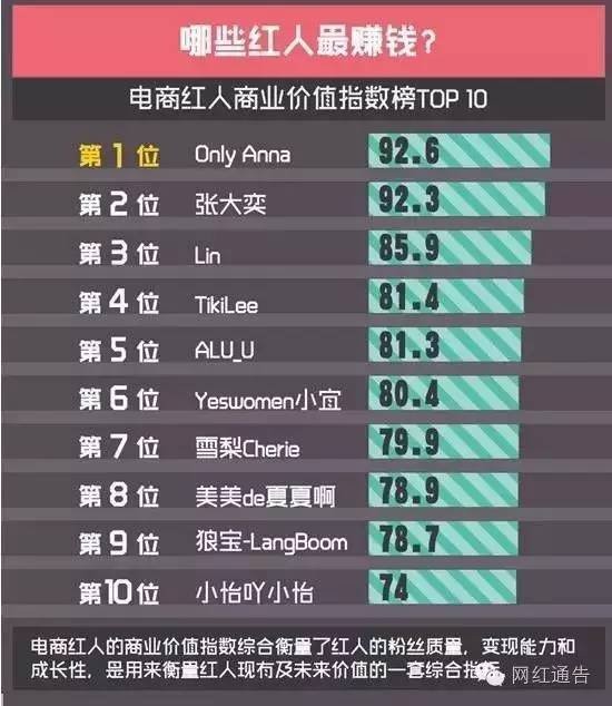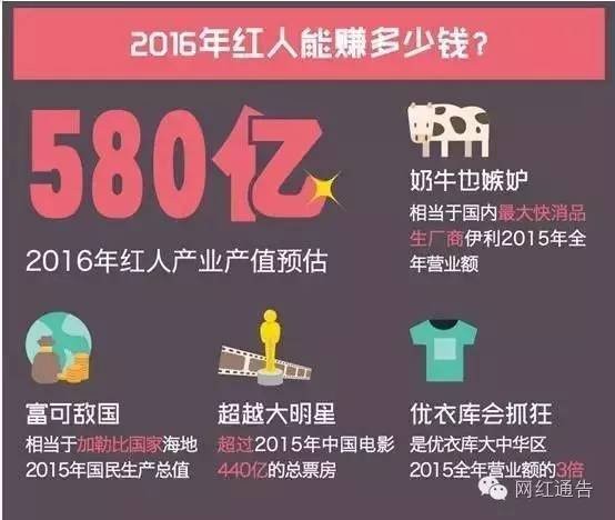 5月23日,第一财经商业数据中心发布《2016中国电商红人大数据报告》,预计2016年红人产业产值预估接近580亿人民币,远超2015年中国电影440亿的票房金额。第一财经这份报告是在综合参考了国家官方统计、阿里集团大数据、新浪微博、优酷土豆、第三方权威机构等多方数据分析形成的,报告同时显示,23岁到28岁的“职场新人类”是网红经济最主要的消费人群,占到消费总人数的49%。