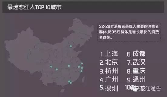 而根据此前有媒体报道来看,雪梨的年收入可达近2亿人民币,超过范冰冰,那么排名在她之前的电商红人的年收入便可想而知了网红已是红海?男性消费、电脑外设等都存在机会而与自媒体红人的广告盈利相比,电子商务依然是目前红人产业中最主要的商业方式。《报告》显示,目前23岁到28岁的“职场新人类”是网红店铺最主要的消费人群,占到消费总人数的49%,此外95后、00后约占消费群总人数的17%。地域分配上,上海、北京、杭州成为了对网红“最买账”的前三城市,而二线城市的粉丝们买下了网红店铺里一半的商品,像四川、湖北等内陆省份,对于网红的追捧全国也是名列前茅。