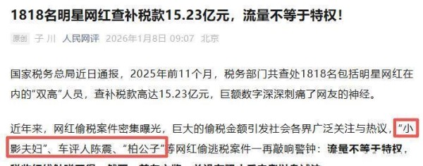 在人民网发布的《1818名明星网红查补税款15.23亿元,流量不等于特权!》评论文章中,“小影夫妇”、车评人陈震、“柏公子”等网红被点名。