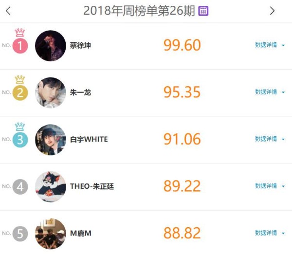 上升速度最快的是排名第四的朱正廷,他在《偶像练习生》里以第六位的排名出道。在广大粉丝的印象里,大家只记得蔡徐坤范丞丞,没想到在几个月之后,朱正廷成为了最大的黑马。