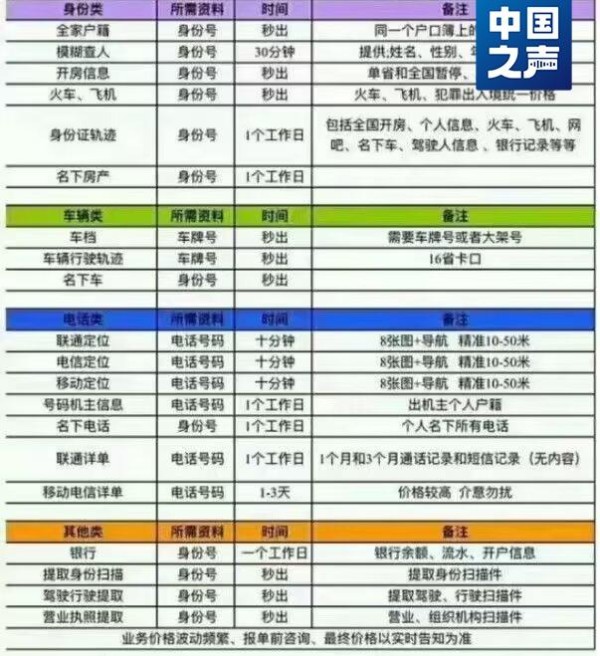 在对方发给记者的论坛上,进一步展示了各类可被“开”的信息:身份类、电话类、车辆类及其他类别等在内的几十种数据,最快“秒出”,慢也只需一到三天就可列出。