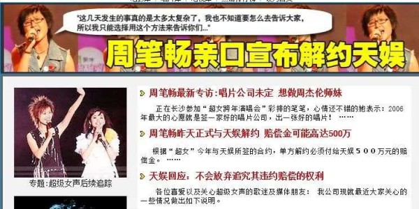 对比龙丹妮在哇唧唧哇所面临的 "塌房"困境,当年她在天娱所面临的困难更多是一地鸡毛的解约风波。2005-2011年间,通过超女快男节目签约天娱传媒的艺人,几乎都会在前两年就与天娱传媒解约,有时甚至闹得十分难看。比如,周笔畅为了解约赔偿了天娱500万,尚雯婕也在比赛结束后没多久就和天娱陷入解约纠纷,原因是不想被包装成第二个李宇春。同样是冠军选手的陈楚生,则选择在2008年的跨年演唱会上突然缺席这种极端的方式,拉开了长达3年的解约官司大幕。