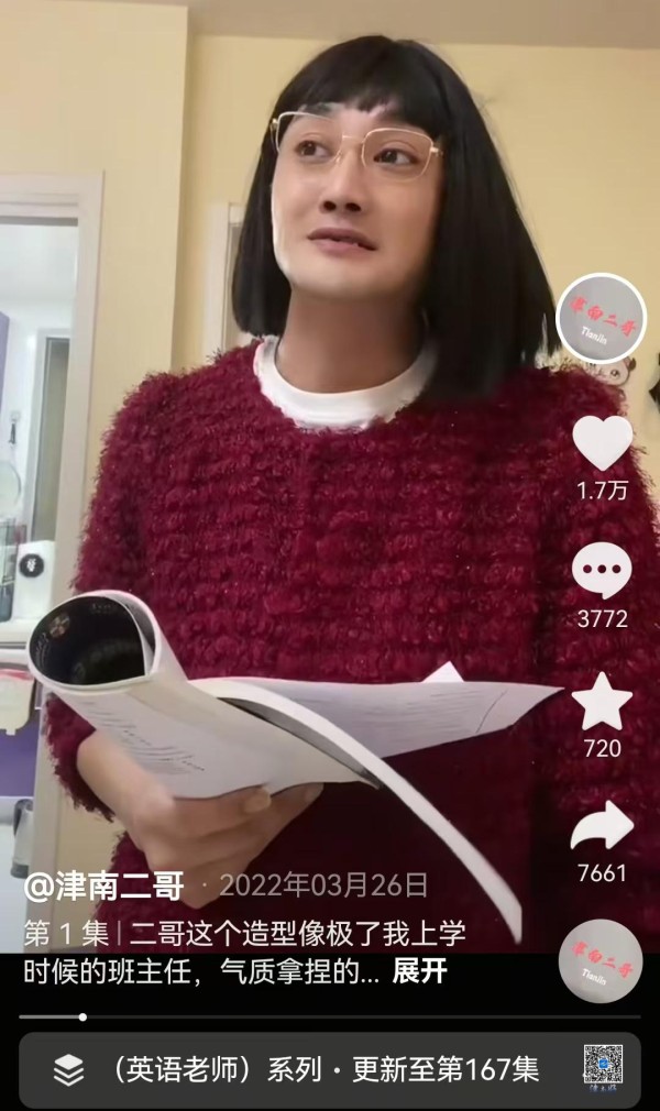 2022年3月6日,津南二哥以反串形式录制的第一段英语老师讲课视频,一夜间获得1.7万点赞量。戏剧性的演绎方式,让他在众多同类视频中脱颖而出,当月涨粉高达50万。他借势发挥,在深耕英语特长的基础上,融入情景设置,力求一集讲通一个知识点。目前,“英语老师”系列视频已经更新到167集,单平台累计播放量达到1.4亿,单篇作品最高点赞量突破39万。来自五湖四海的观众纷纷留言:“二哥一分钟就给讲明白了。”