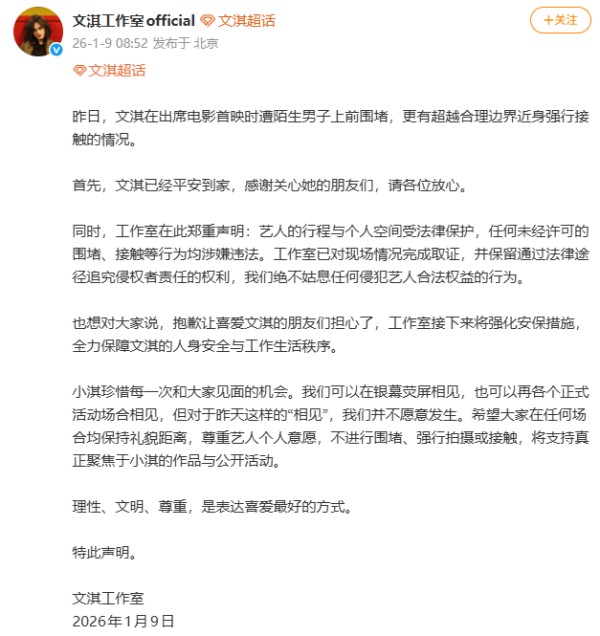 也想对大家说,抱歉让喜爱文淇的朋友们担心了,工作室接下来将强化安保措施,全力保障文淇的人身安全与工作生活秩序。