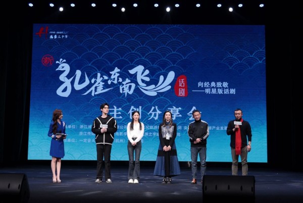 活动现场,话剧《新孔雀东南飞》制作人林心月、编剧高乐、艺术总监单磊及主角颜妮、陆弘炜悉数亮相,揭秘创作幕后故事。