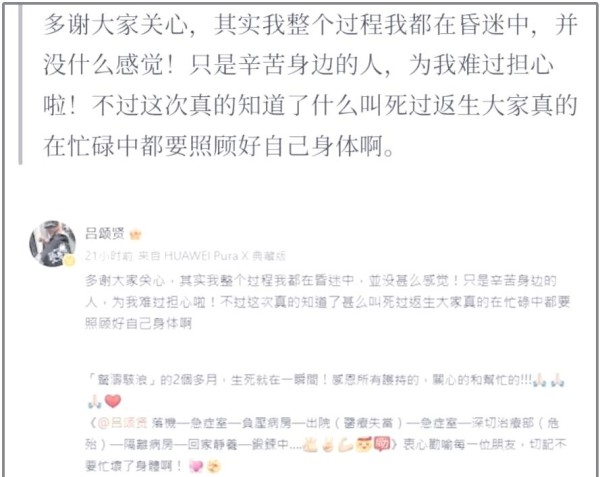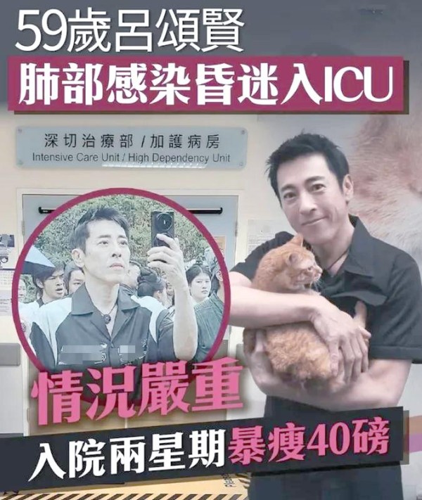 吕颂贤因肺部感染陷入昏迷,紧急转入ICU治疗。