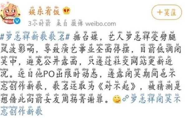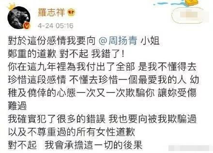 罗志祥继520男孩女孩长文后,疑似出一首新歌《对不起》写给谁?