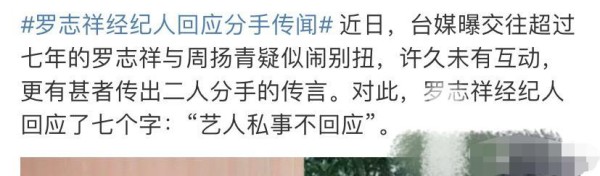 3月初的时候,有媒体报道罗志祥分手的消息,但是当事人都没有正面回应此事,大家也都只是猜测,但是看到经纪人的回应之后,网友表示看来是真的了。