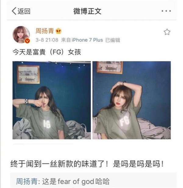 随后周扬青也发了微博,穿着fog的T恤发了两张自拍,配文“今天是富贵(FG)女孩”。被网友指出疑似diss罗志祥的潮牌抄袭。