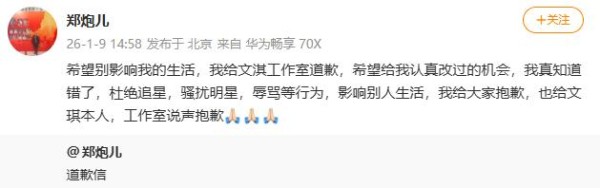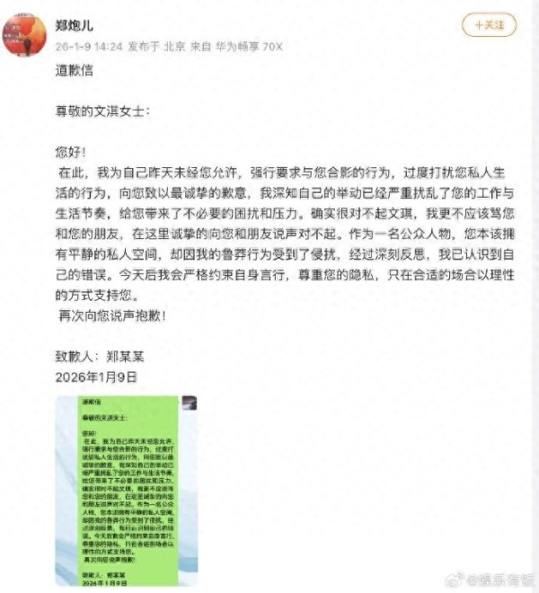 今天(1月9日)下午,名为“郑炮儿”的网友发布公开道歉信,向@演员文淇致歉。他表示,为自己昨天未经允许,强行要求合影的行为,过度打扰艺人私人生活的行为,致以最诚挚的歉意,“我深知自己的举动已经严重扰乱了您的工作与生活节奏,给您带来了不必要的困扰和压力。
