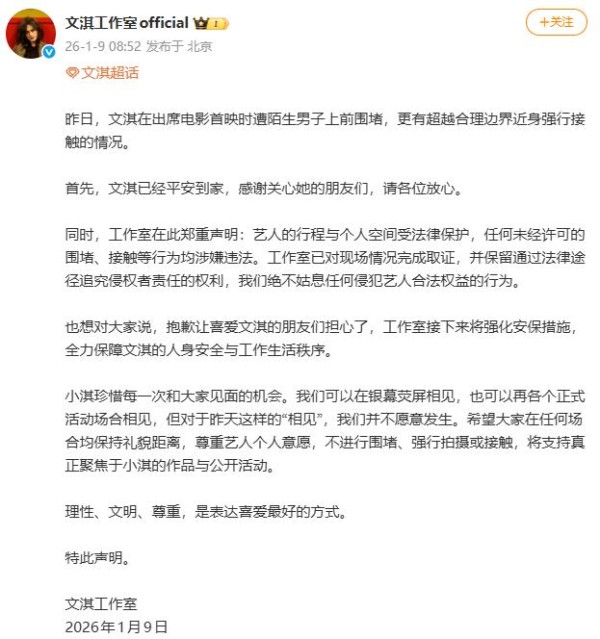 也想对大家说,抱歉让喜爱文淇的朋友们担心了,工作室接下来将强化安保措施,全力保障文淇的人身安全与工作生活秩序。