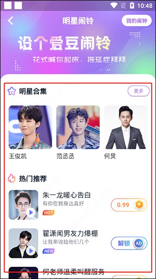 3、在明星闹铃中为用户提供了海量爱豆明星的专属起床闹铃供大家自由设置;