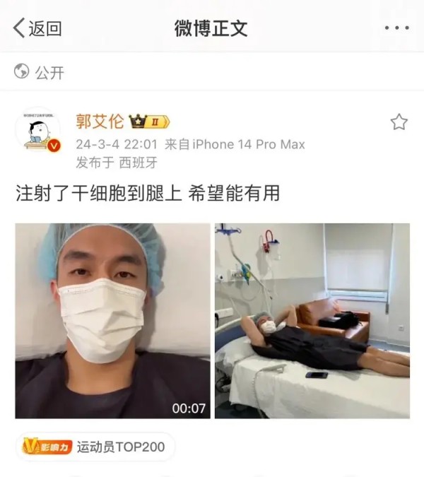 郭艾伦西班牙治疗腿伤最新消息爆出,注射C罗和科比同款的天价干细胞,愿郭艾伦早日康复,早日回归赛场。